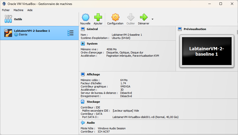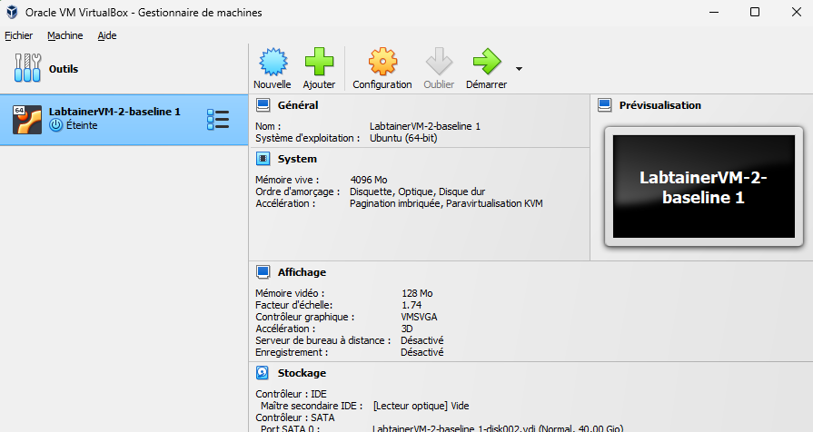 Pour faciliter sa mise en place, nous allons importer dans VirtualBox une VM préparée par le Naval Postgraduate School avec Labtainer déjà installé.