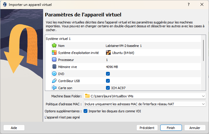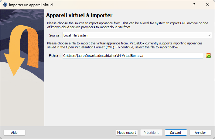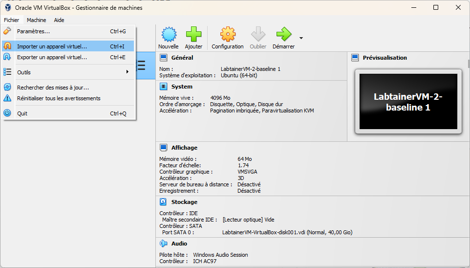 Pour créer la VM dans VirtualBox, il suffit d'importer le fichier LabtainerVM-VirtualBox.ova qui contient une image de la VM Labtainer.