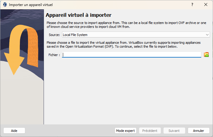 1. Cliquez sur le bouton "Importer" dans l'écran de Bienvenue de VirtualBox ou dans le menu Fichier sur le "Importer un appareil virtuel..."