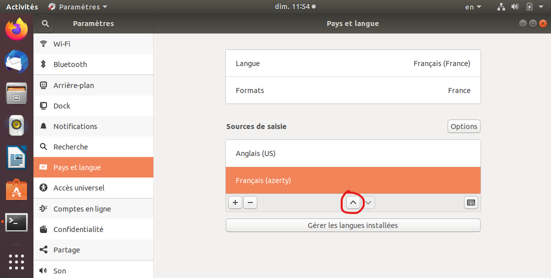 • Sélectionnez Français (azerty) et cliquez sur le bouton "^" pour mettre la langue française en 1ère position.