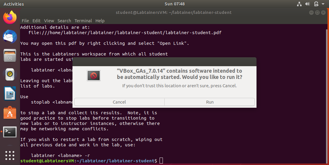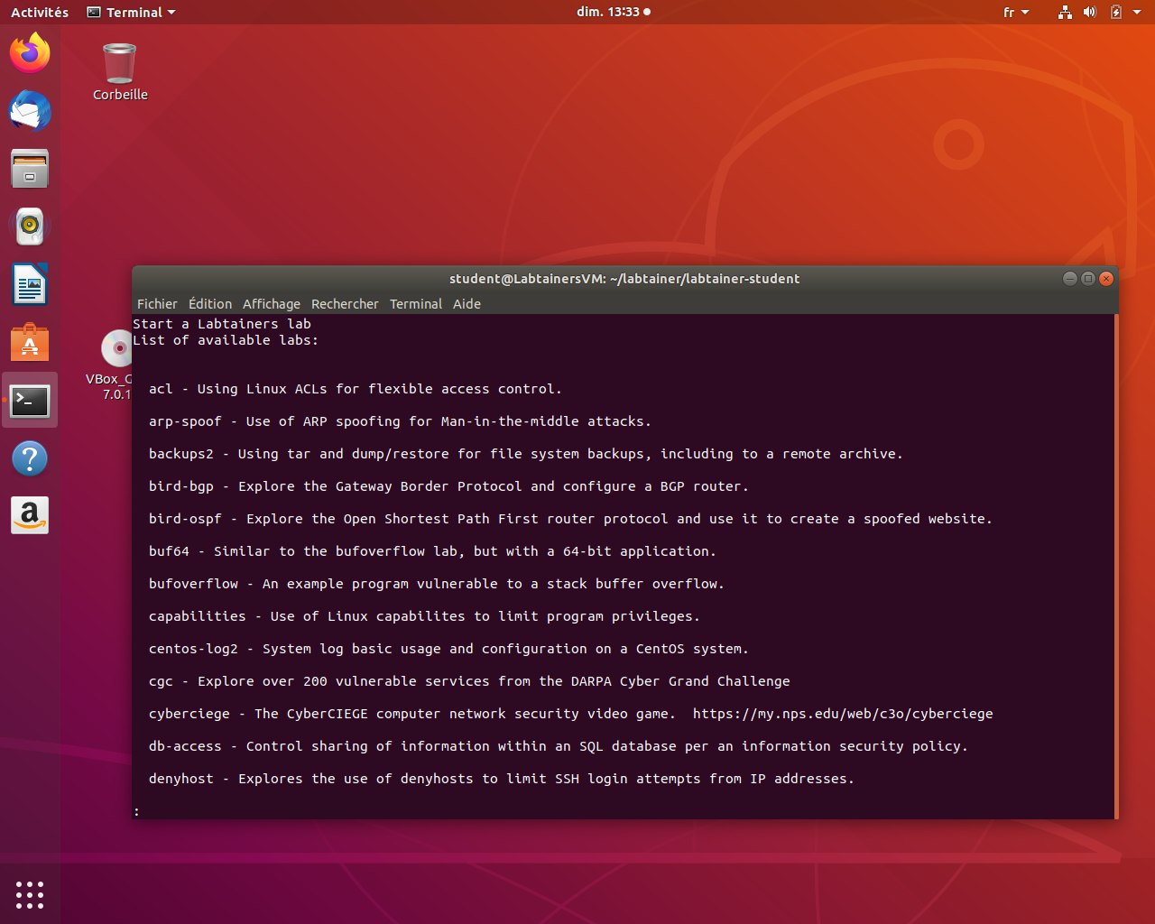 Voici le lien pour télécharger la dernière version de la VM Labtainer : VirtualBox VM Appliance (sha256:1b45ef52b90512c56bb81e8e0000e86043b992091ec9264ab7f0ff140460a0c6)