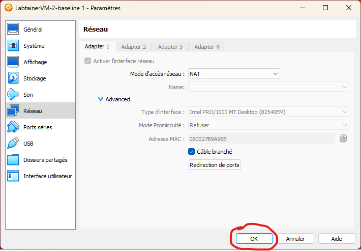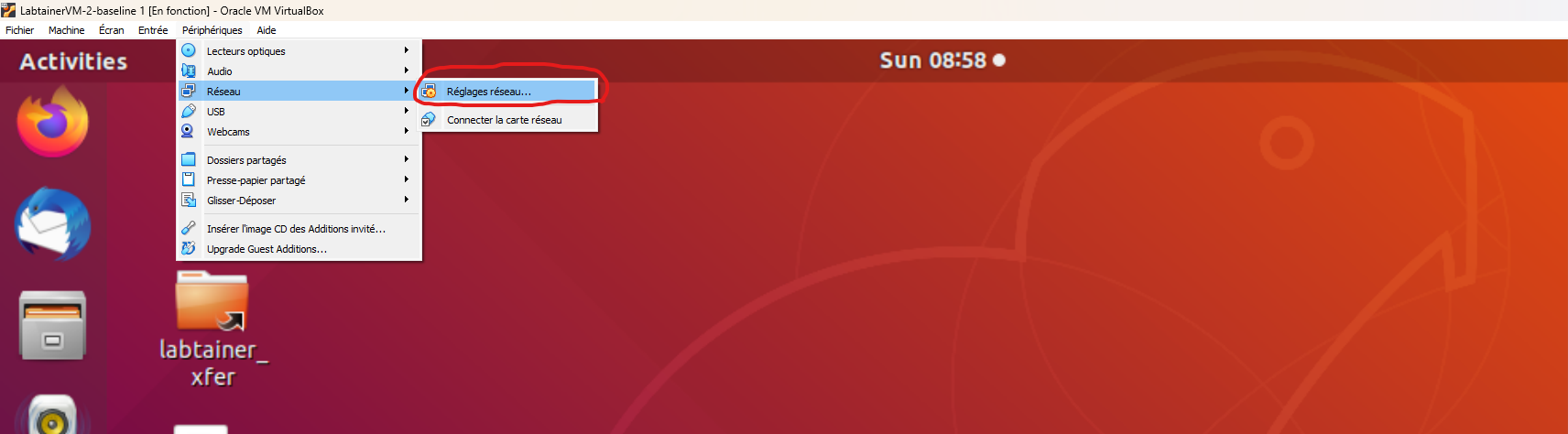 • Cliquez, dans le menu de la fenêtre VirtualBox de la VM, sur Réseau puis sur Réglages réseaux...