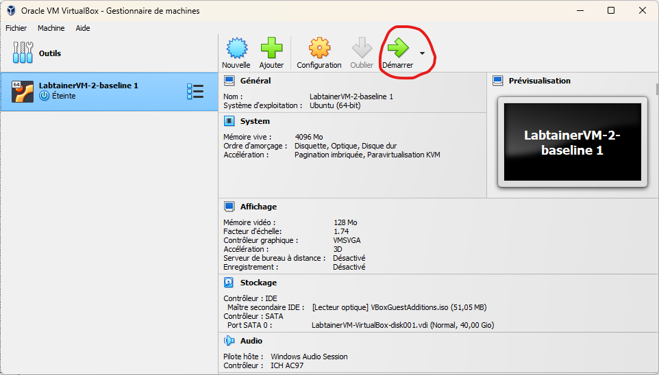 • Cliquez sur le nom de la VM LabtainerVM-xx (Eteinte) puis sur le bouton Démarrer