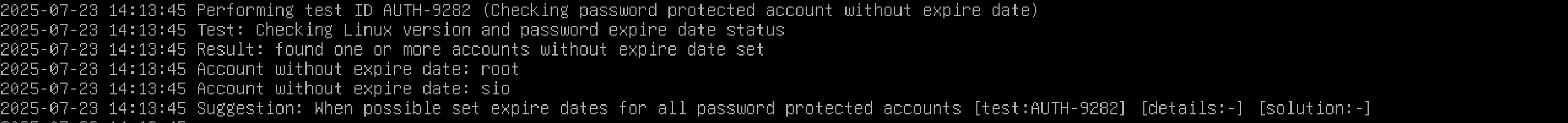 Utiliser less /var/log/lynis-report.dat et rechercher les lignes autour de "AUTH-9282" pour trouver "Result: found one or more accounts without expire date set" avec les comptes root et sio listés.