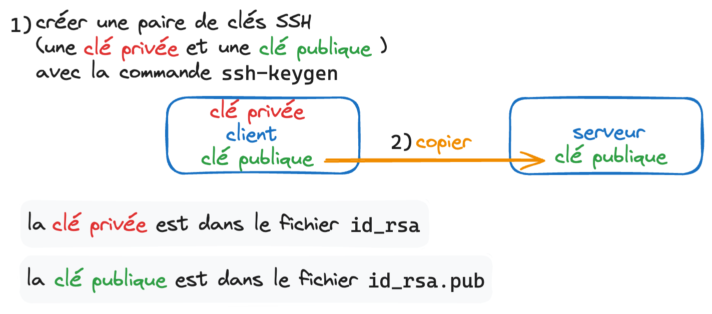 • la clé publique est copiée sur tous les serveurs sur lesquels on souhaite se connecter sans mot de passe