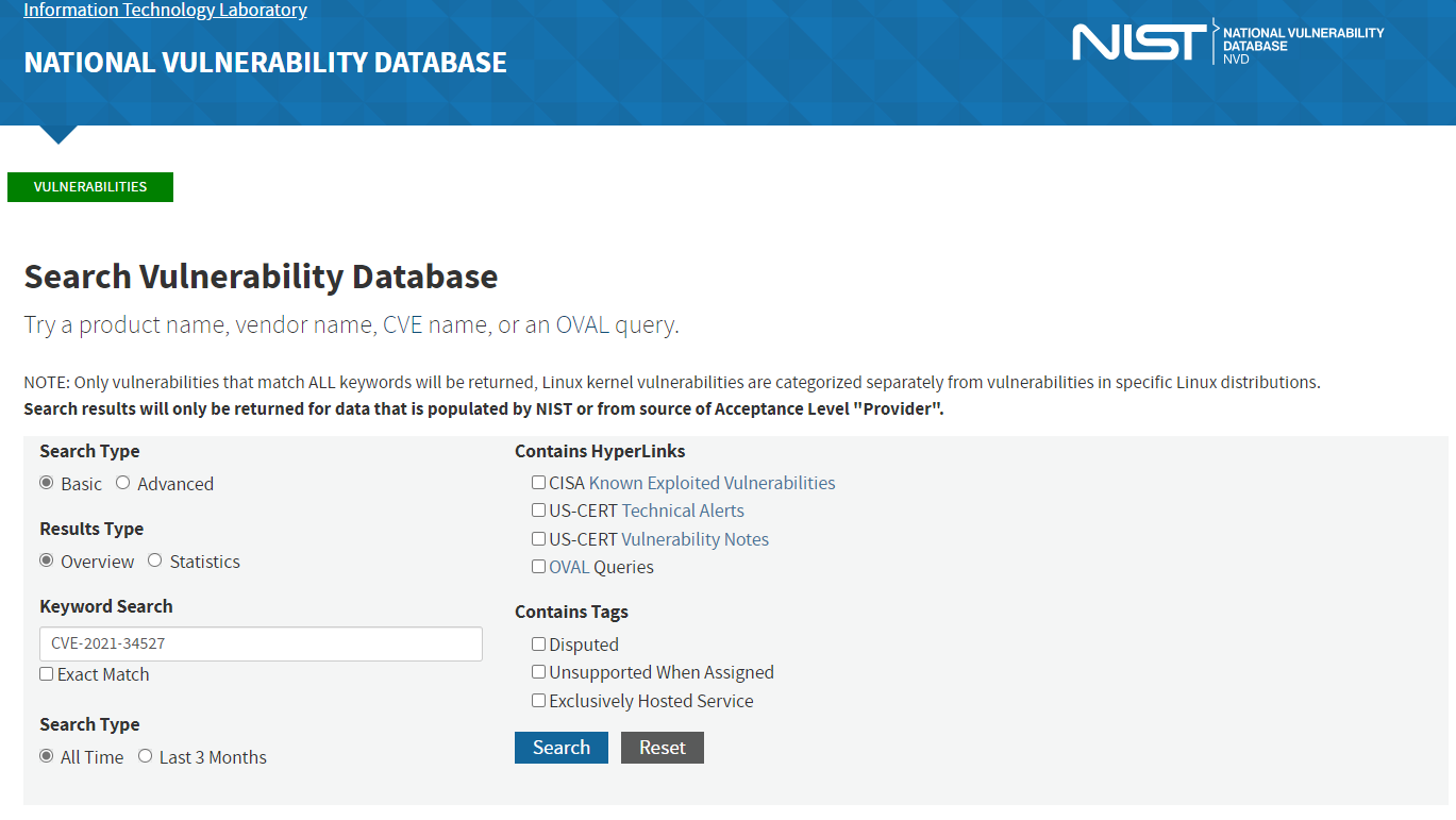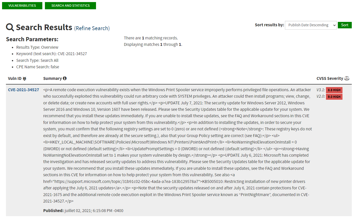 Nous pouvons rechercher la vulnérabilité CVE-2021-34527 dans la base de données du NIST https://nvd.nist.gov/vuln/search.
