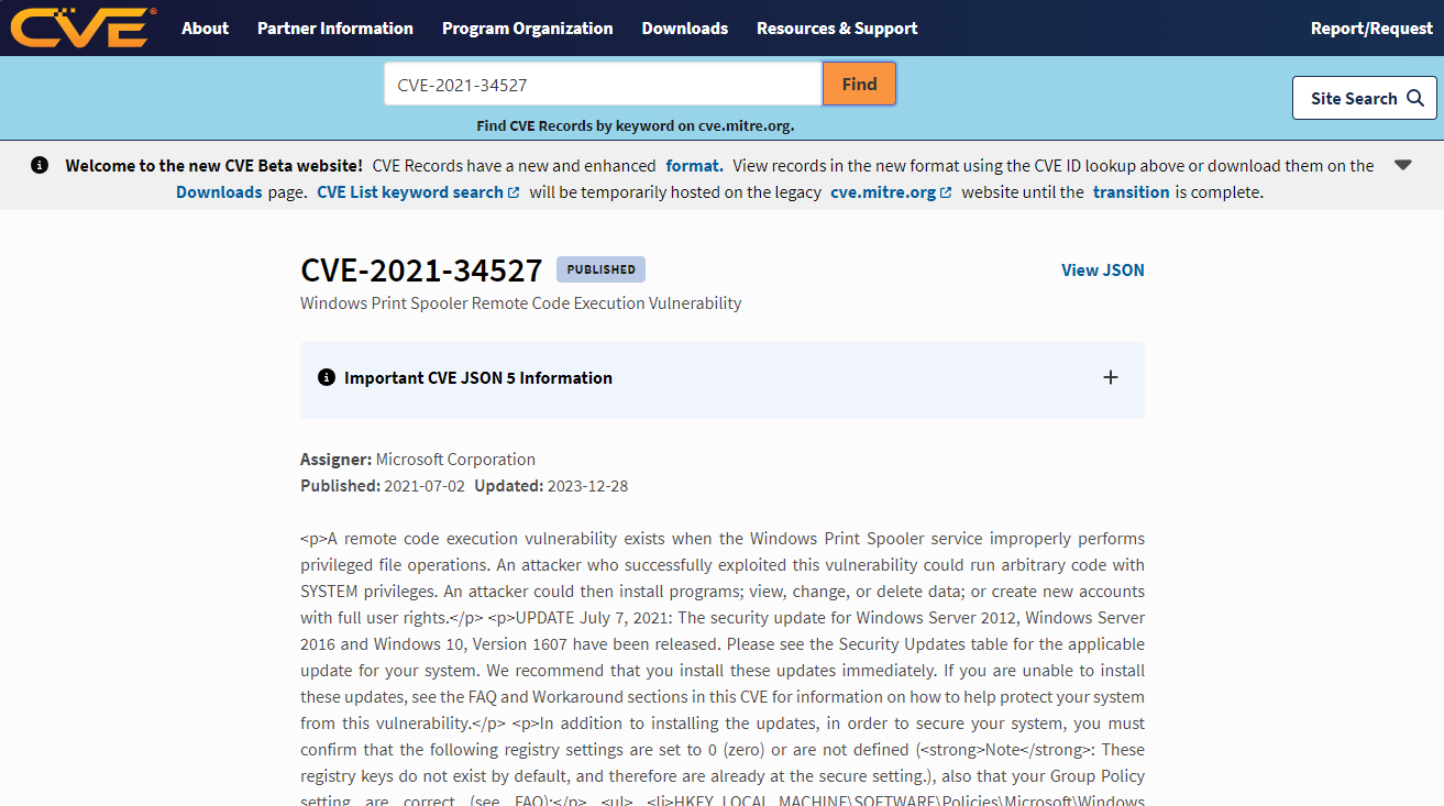 Nous pouvons rechercher la vulnérabilité CVE-2021-34527 dans la base de données du NIST https://www.cve.org/.
