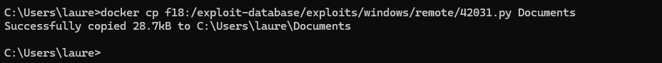 Pour examiner un exploit spécifique plus en détails, il suffit d'utiliser la commande suivante pour copier le fichier de cet exploit du conteneur Docker vers votre machine hôte (assurez-vous de remplacer <path-to-exploit> par le chemin réel de l'exploit que vous souhaitez examiner) :