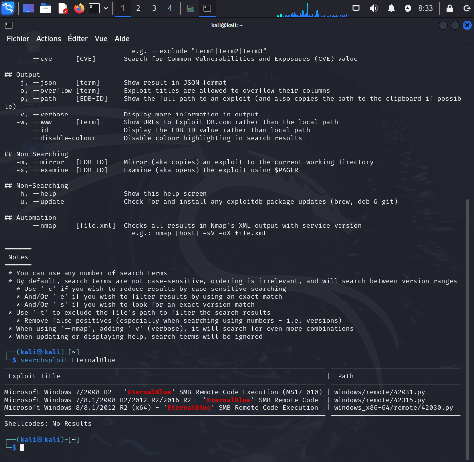 Cette commande affichera toutes les entrées liées à EternalBlue dans la base de données Exploit Database. Vous devriez voir des résultats spécifiques à différentes versions de Windows, y compris Windows 7.