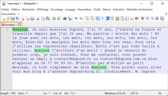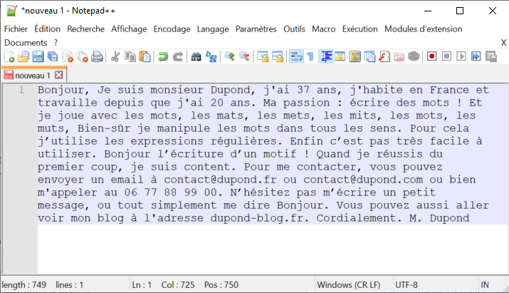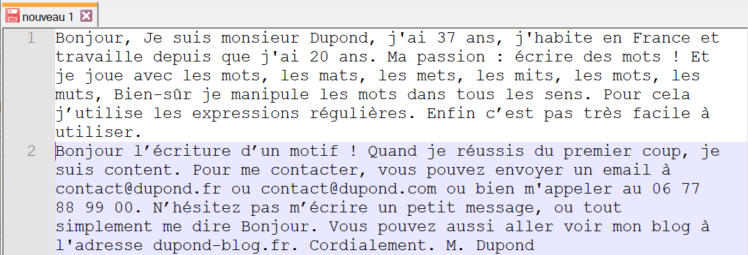 Bonjour, Je suis monsieur Dupond, j'ai 37 ans, j'habite en France et travaille depuis que j'ai 20 ans. Ma passion : écrire des mots ! Et je joue avec les mots, les mats, les mets, les mits, les mots, les muts, Bien-sûr je manipule les mots dans tous les sens. Pour cela j'utilise les expressions régulières. Enfin c'est pas très facile à utiliser. Bonjour l'écriture d'un motif ! Quand je réussis du premier coup, je suis content. Pour me contacter, vous pouvez envoyer un email à contact@dupond.fr ou contact@dupond.com ou bien m'appeler au 06 77 88 99 00. Vius pouvez m'écrire un petit message, ou tout simplement me dire Bonjour. Vous pouvez aussi aller voir mon blog à l'adresse dupond-blog.fr. Cordialement. M. Dupond