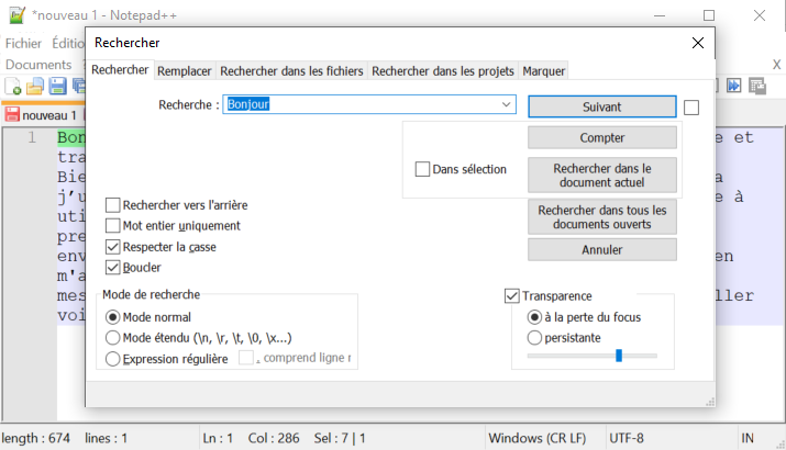 Pour chercher du texte dans Notepad++, il suffit d'utiliser la combinaison de touches « CTRL + F »