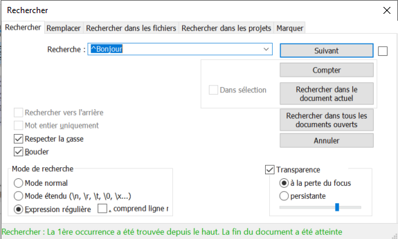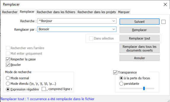 Nous souhaitons uniquement trouver le mot « Bonjour » en début d'un paragraphe, pour le remplacer par le mot « Bonsoir », et pas tous les mots « Bonjour ».
