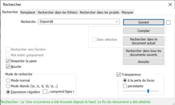 Si vous avez utilisé le pattern dupond.[a-z]3 sans \ devant . (le point) le texte dupond-blo se retrouve sélectionné.