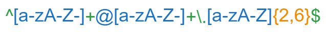 Dans ce pattern ^[a-zA-Z-]+@[a-zA-Z-]+\.[a-zA-Z]{2,6}$, le {2,6} est un quantificateur qui spécifie que le caractère ou le groupe de caractères qui le précède doit apparaître au moins 2 fois et pas plus de 6 fois. Cela s'applique à la partie de l'expression régulière qui précède immédiatement le quantificateur.