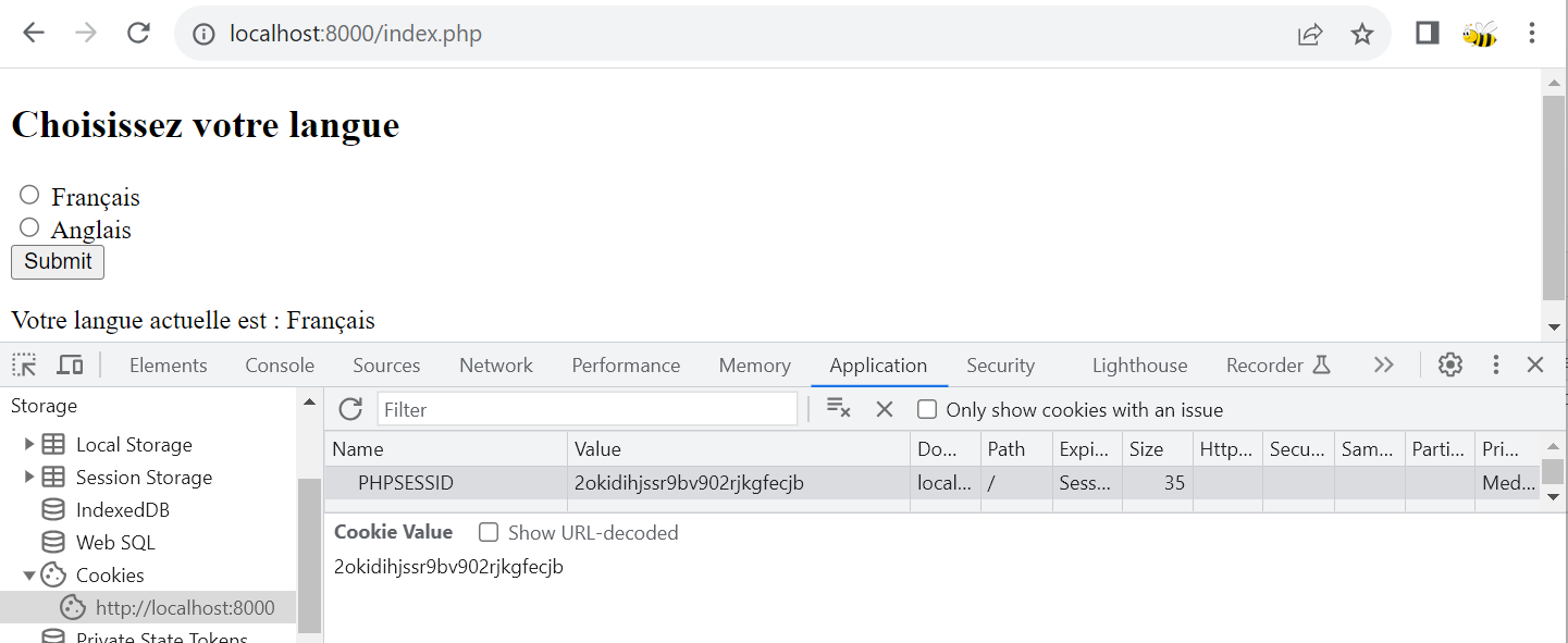 Avec ces étapes, vous avez créé une application simple qui utilise les sessions pour mémoriser la préférence de langue de l'utilisateur.
