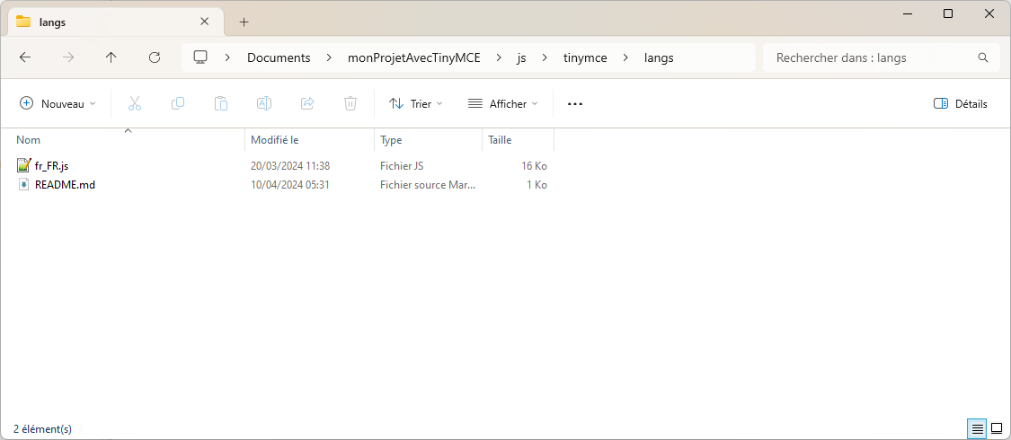 d'extraire le contenu du fichier ZIP du package de la langue française de TinyMCE, dans le dossier