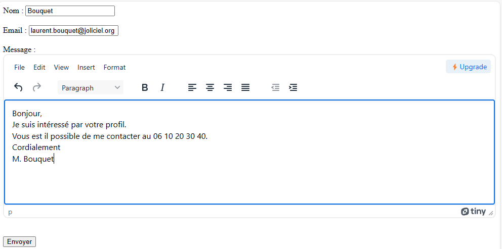 Votre tâche consiste à créer un formulaire de contact simple en PHP qui utilise TinyMCE pour la saisie du message.