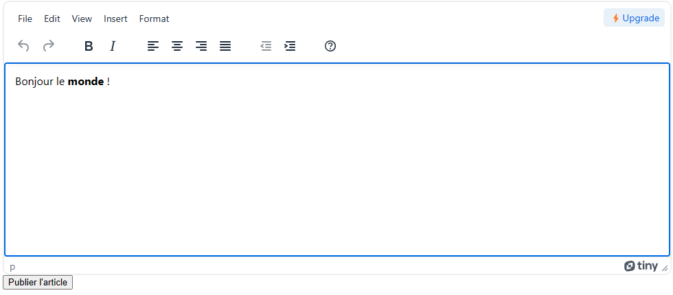 Si vous voulez proposer plus de fonctionnalités à vos internautes, vous pourriez intégrer TinyMCE dans le formulaire de création d'article comme suit :