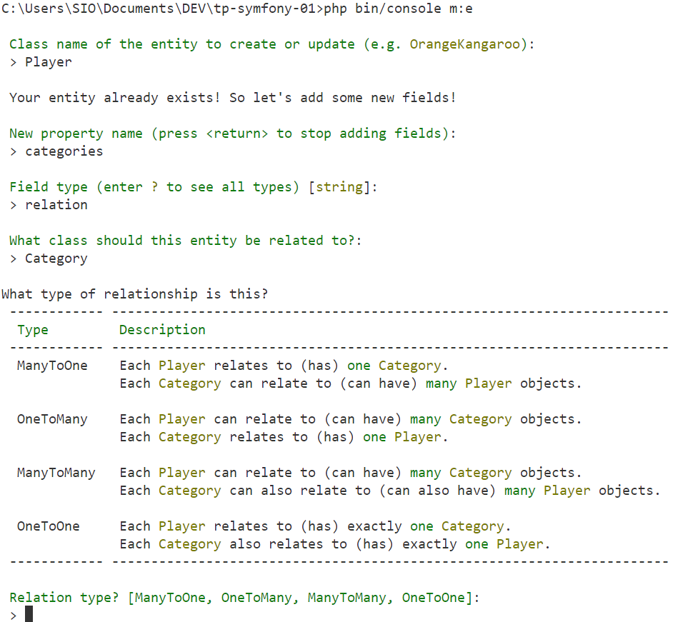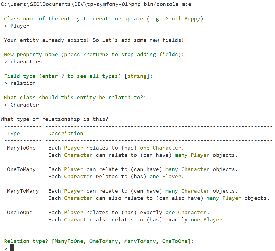 Characteravec une relation ManyToOne versPlayer, - et ajoutez une relation OneToMany de