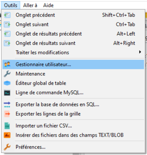 Dans HeidiSQL, cliquez dans le menu sur « Outils » - « Gestionnaire utilisateur... ».