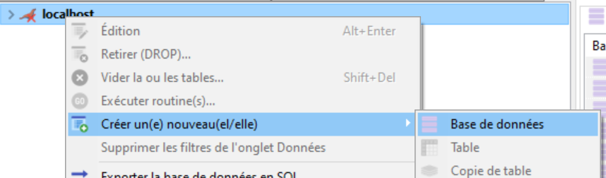 un clic droit sur le nom du serveur (localhost), puis créer une nouvelle