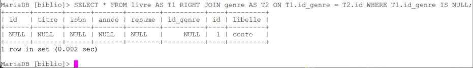 - Dans notre exemple, cela va retourner uniquement les livres n’ayant pas de genre. Les lignes retournées auront certains de leurs champs mis à NULL vu qu’on ne prend pas en compte les champs de T2.