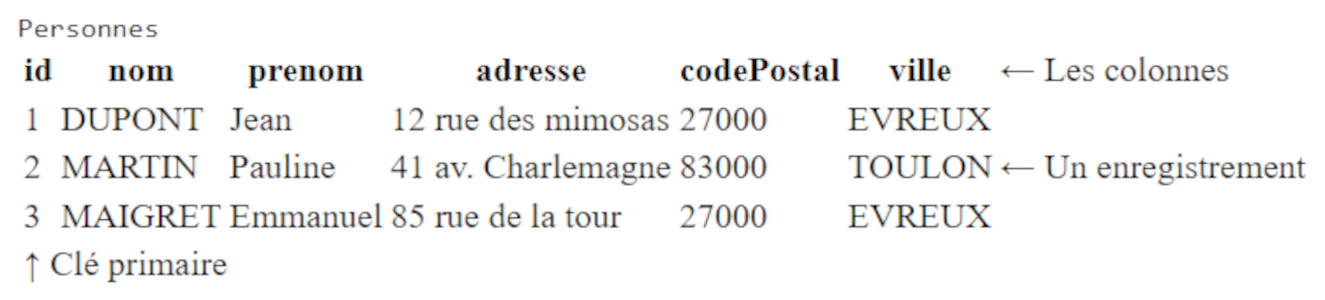 - Chaque enregistrement doit être identifié par une donnée unique stockée dans une colonne spéciale appelée clé primaire.