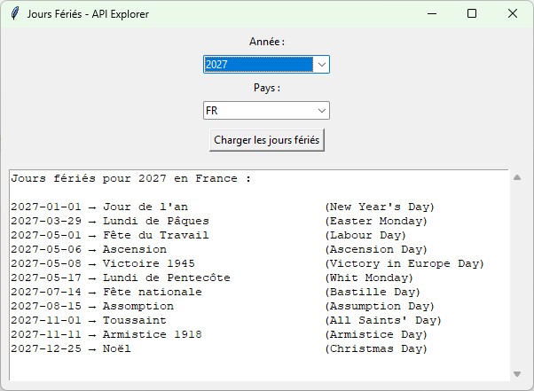 - Elle récupère les jours fériés et les affiche dans une zone de texte avec défilement.