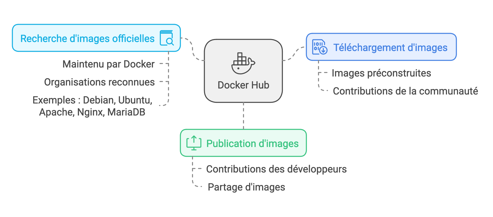 Docker Hub est une plateforme en ligne qui permet de stocker, partager et découvrir des images Docker.