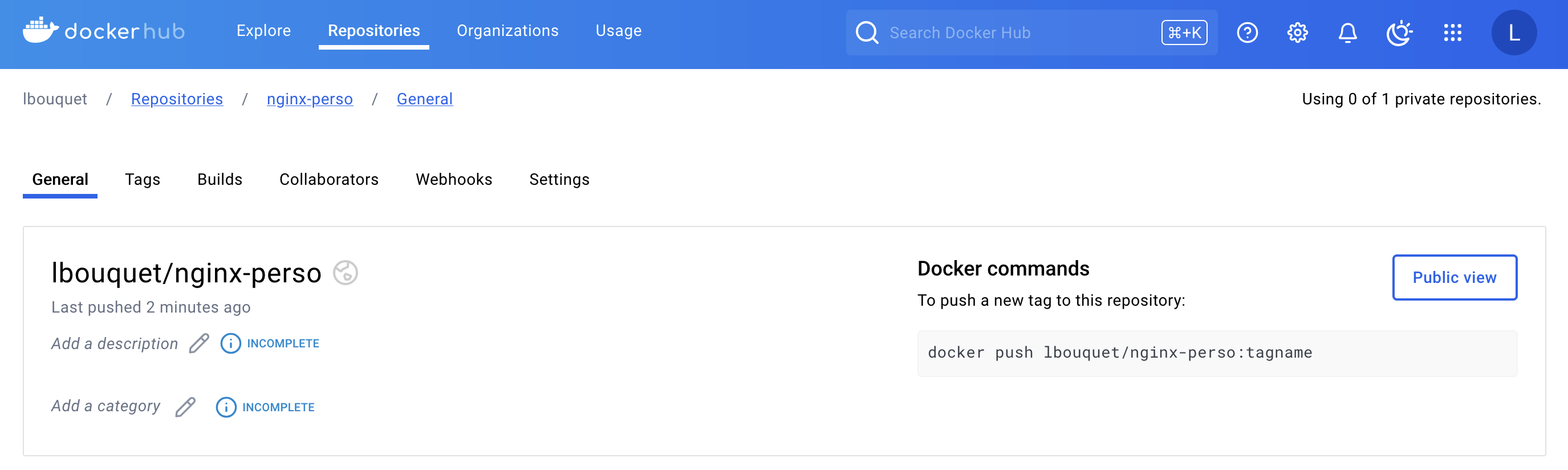 USERNAME/nginx-perso.attentionUSERNAMEest l'identifiant que vous utilisez pour vous connecter au Docker Hub sur le site https://hub.docker.com/. -