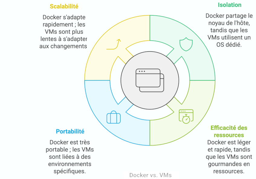 Docker privilégie la portabilité et l'efficacité, tandis que les VMs offrent une isolation complète.