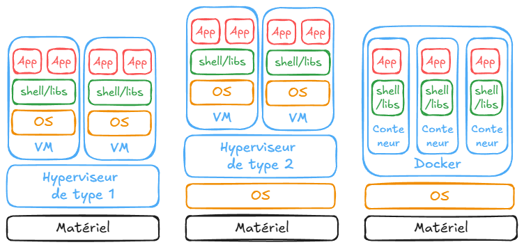 - Docker : Conteneurs légers partageant le noyau de l'hôte.