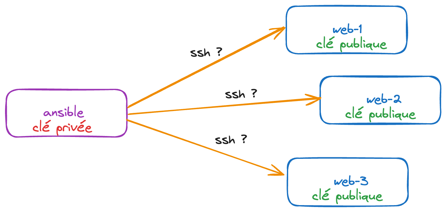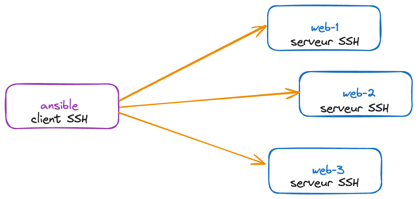 Dans notre configuration, le serveur Ansible est considéré comme un poste client qui va se connecter (via le protocole SSH) aux serveurs cibles.