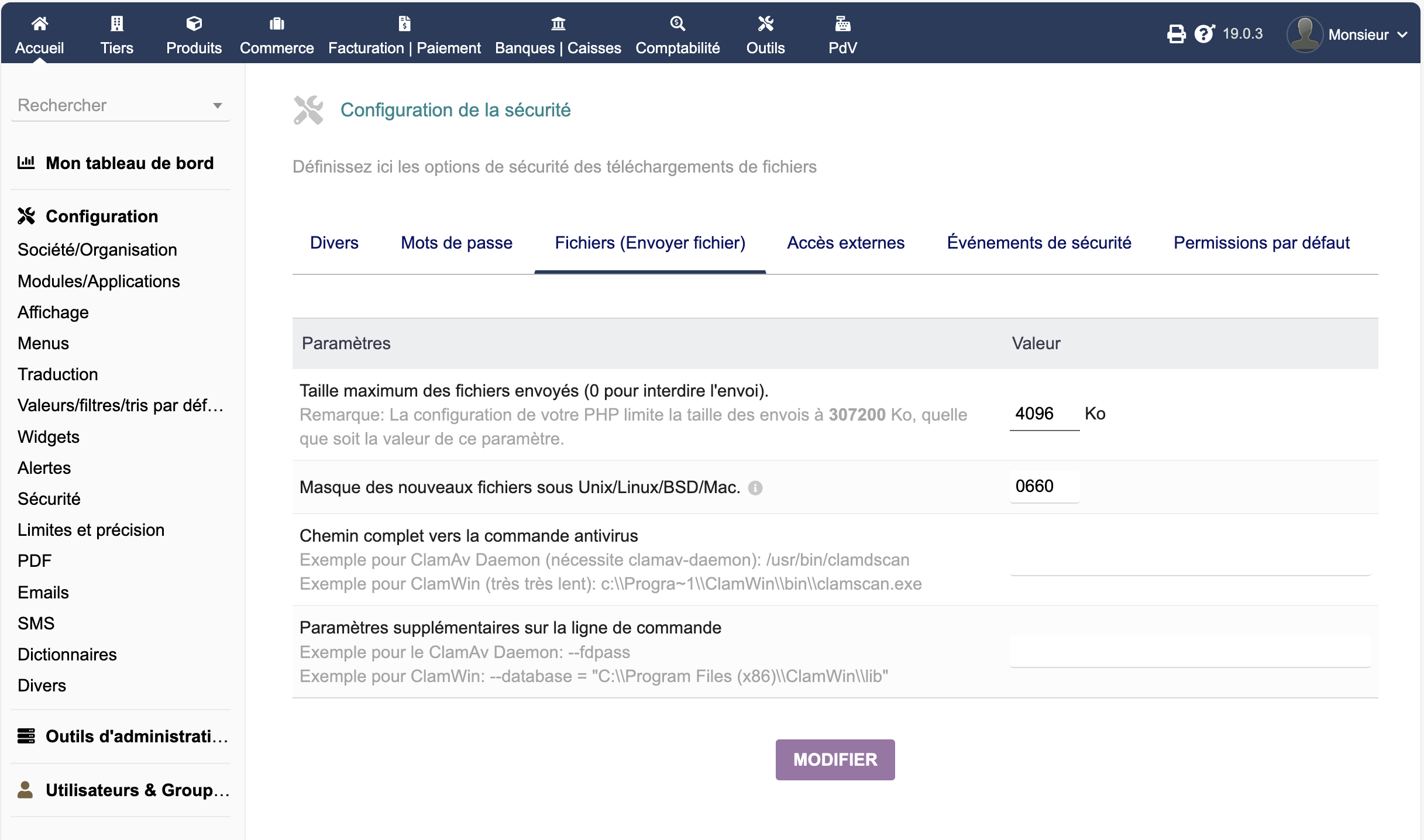 Aller dans "Accueil > Configuration > Sécurité > Fichier"