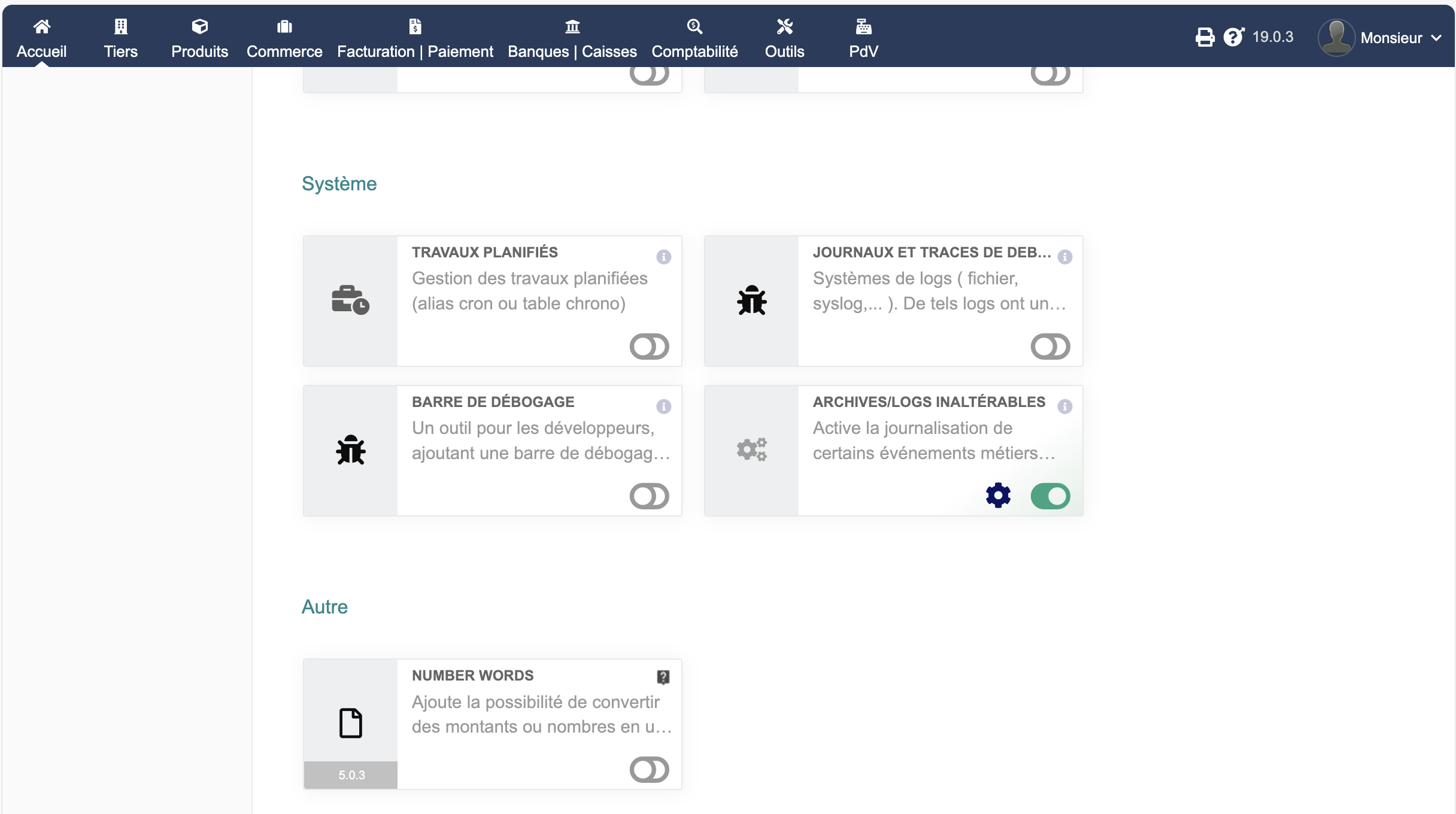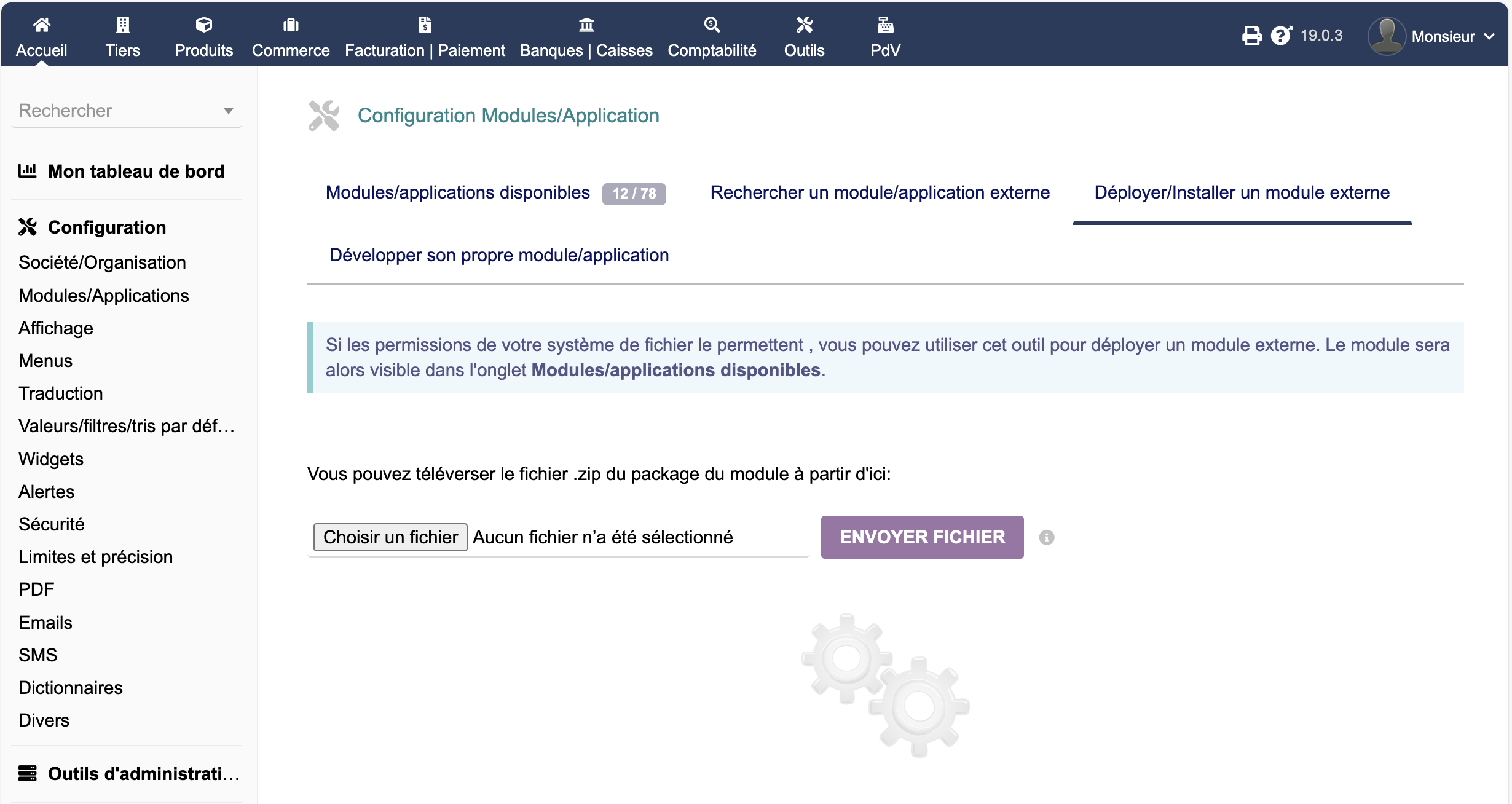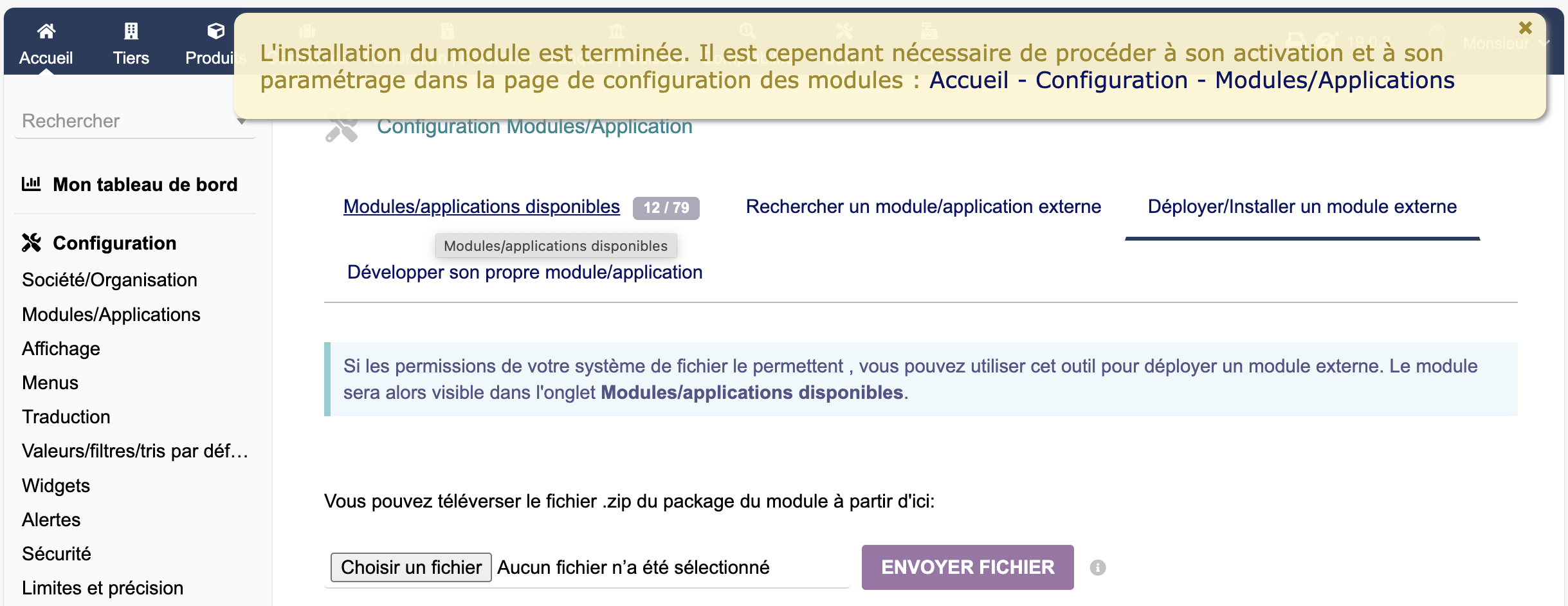 Pour installer un module téléchargé depuis le DoliStore, vous devez disposer des droits d'administration.