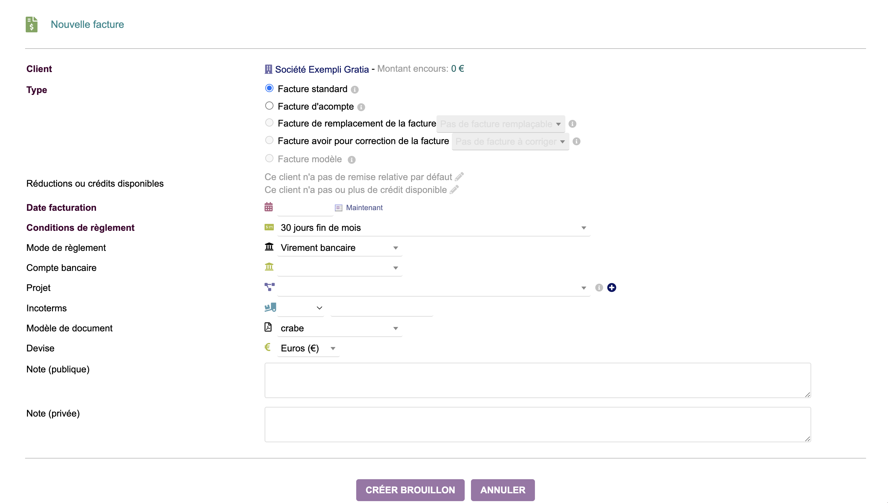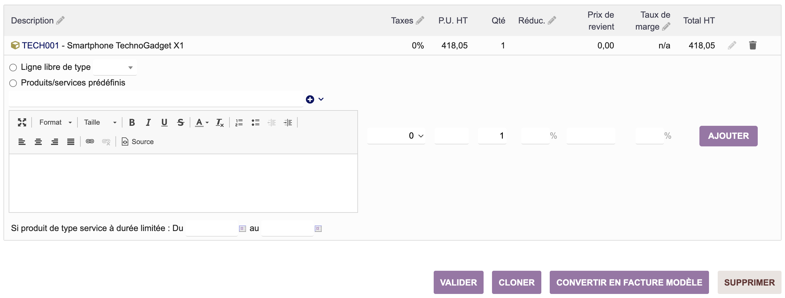 6. Créez une facture pour le client que vous avez ajouté, en incluant le produit que vous venez de créer.