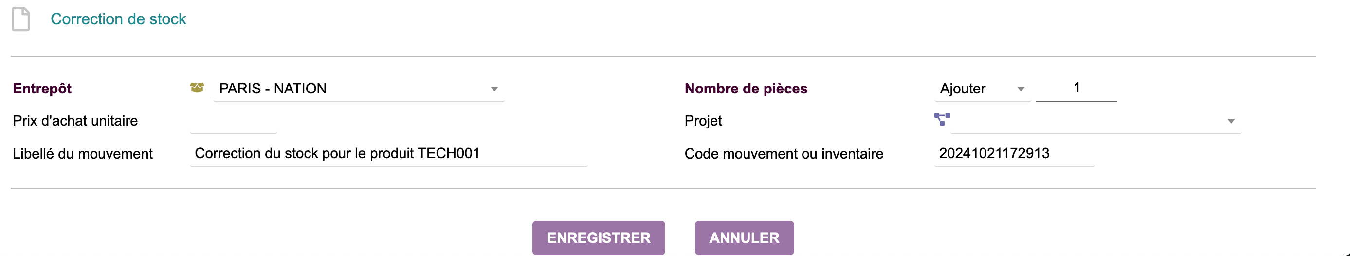 (Correction de stock pour l'entrepôt "PARIS - NATION", Nombre de pièces : Ajouter 1)