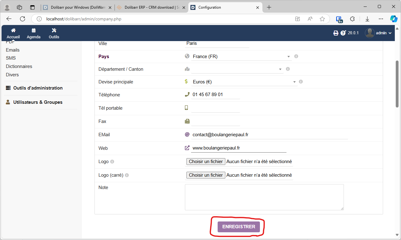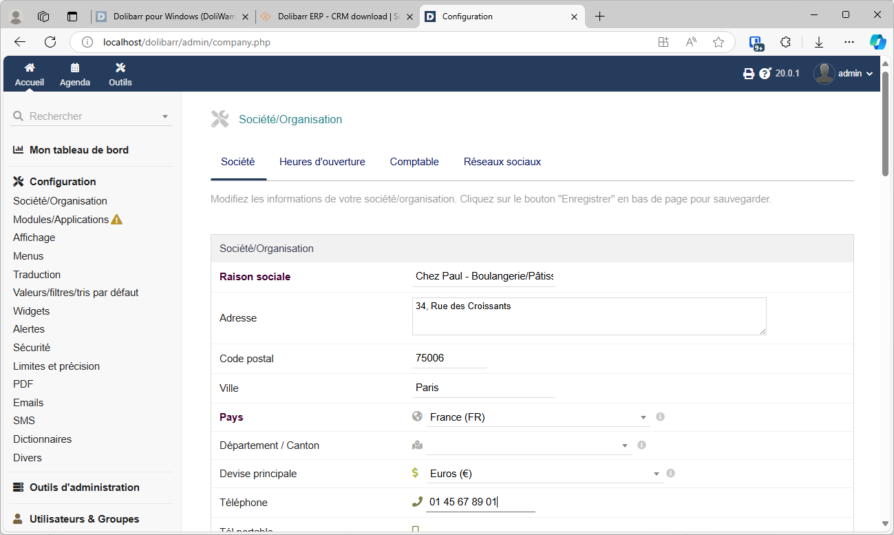 Paramétrez une entreprise fictive dans Dolibarr, par exemple une boulangerie/Pâtisserie, et remplissez toutes les informations nécessaires sur l’entreprise (nom, adresse, contact, etc.).