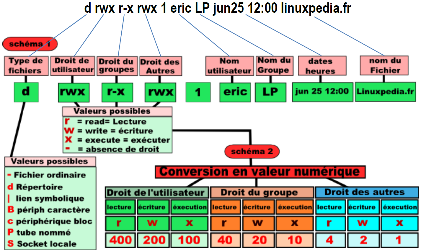 - et une permission "read-execute" sera représentée par 5 (4+1).