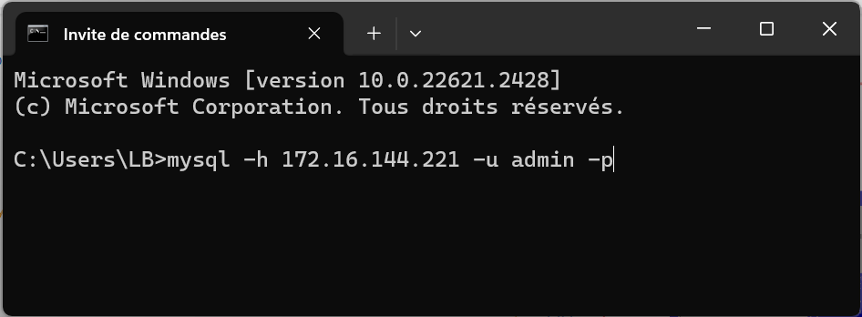 etudiant(mot de passe =1mot2Passe+QueTresSécurisé) :mysql -u etudiant -pL'indication du 'host' n'est pas nécessaire, par défaut ce sera