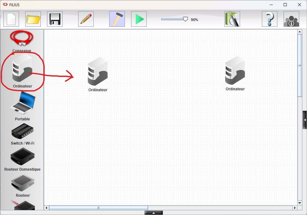 Dans la barre d'outils, cliquez sur l'icône "Ordinateur" et placez 2 ordinateurs sur la zone de travail.
