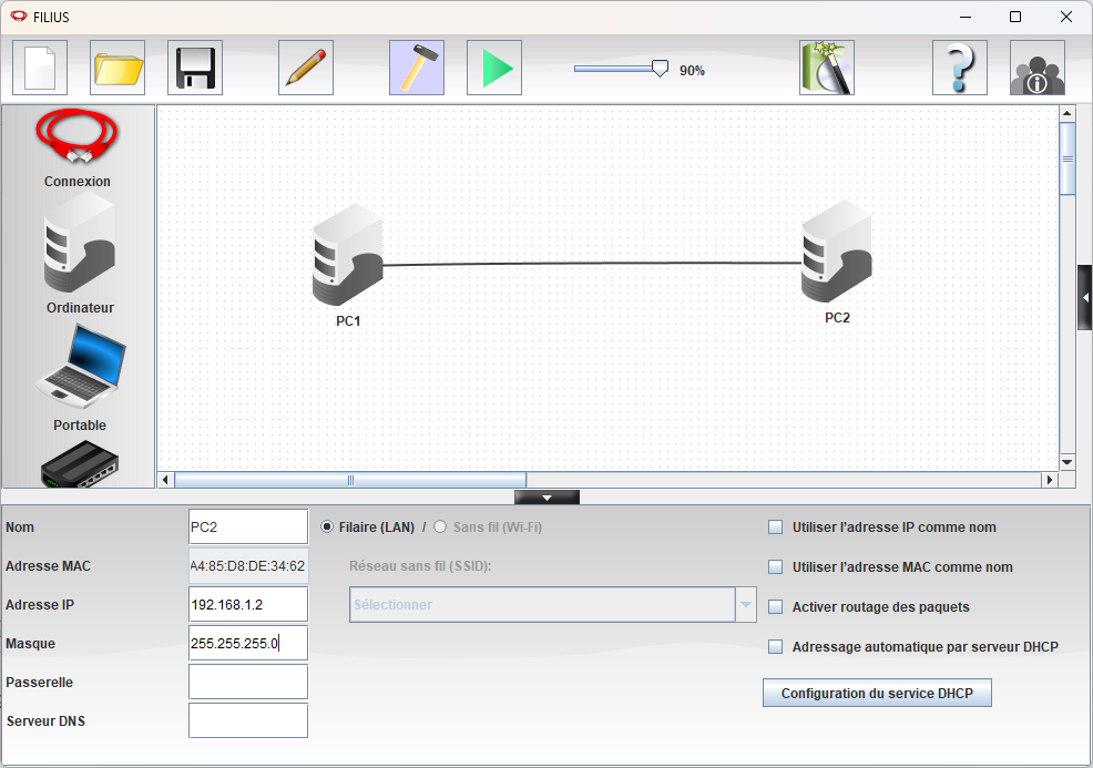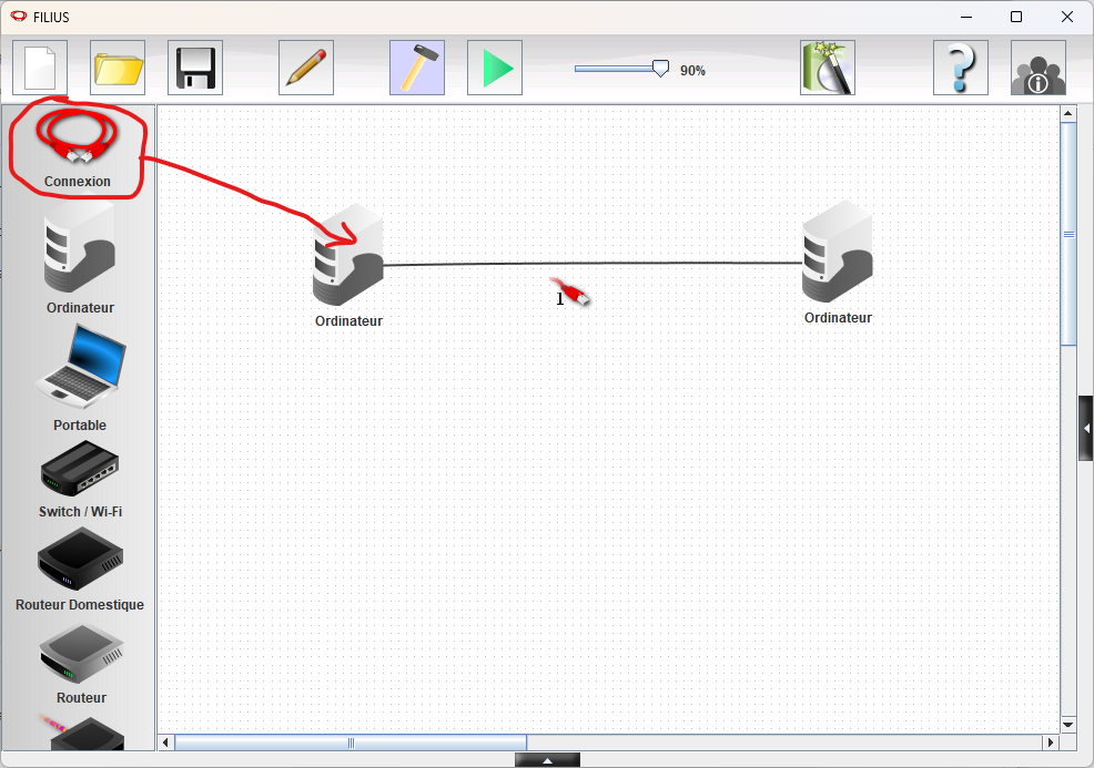 Sélectionnez l'outil "Connexion" et reliez les 2 ordinateurs en cliquant sur chacun d'eux.