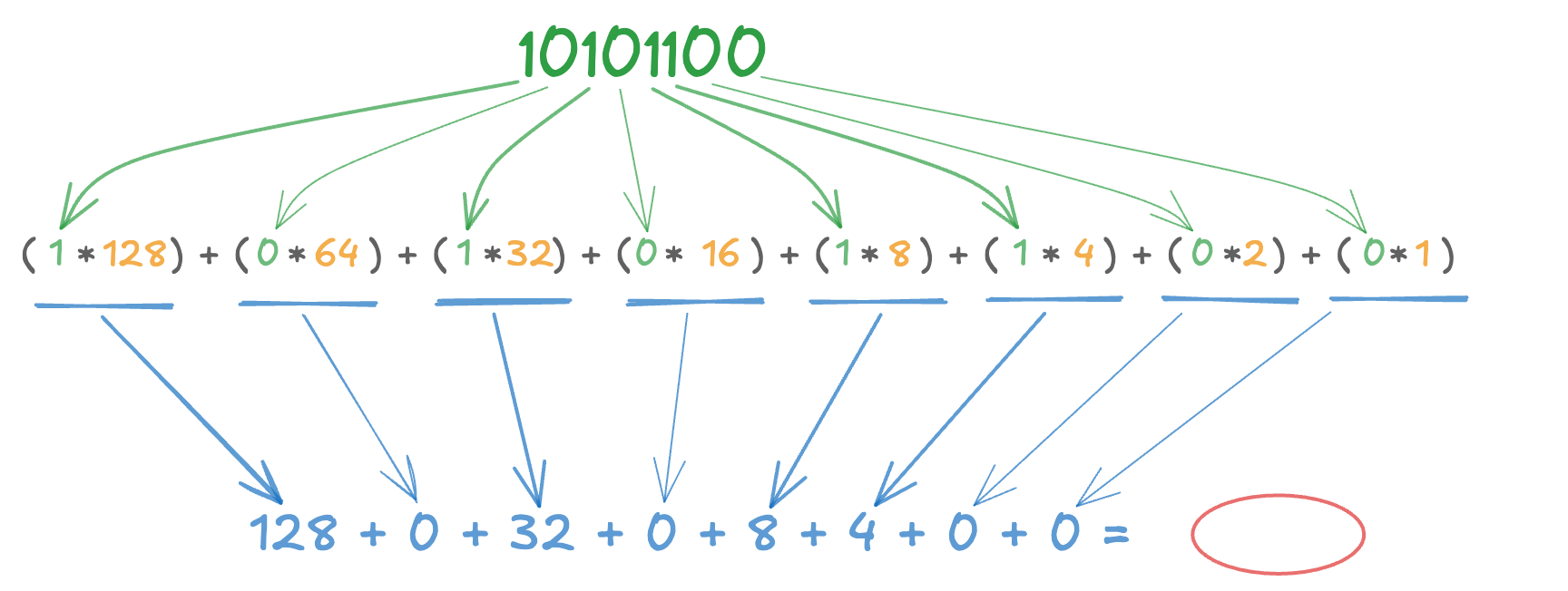 Multiplier chaque bit (0 ou 1) par la valeur de sa position : 128, 64, 32, 16, 8, 4, 2 et 1