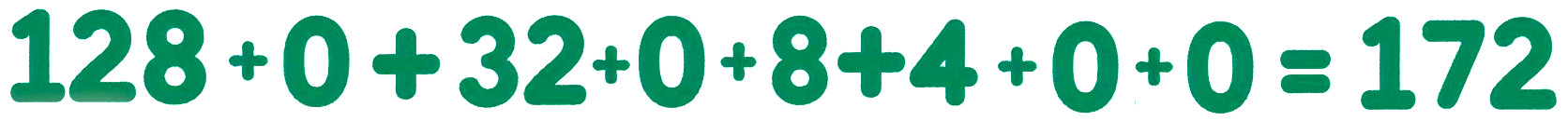 - 128 + 0 + 32 + 0 + 8 + 4 + 0 + 0 = 172