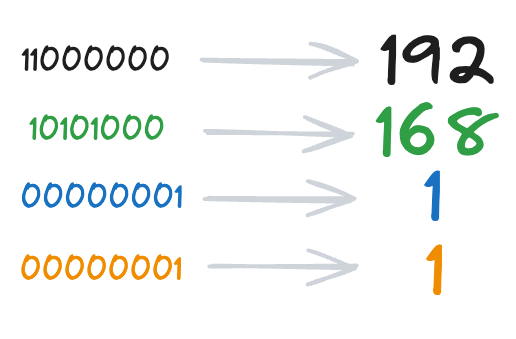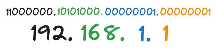 - 11000000.10101000.00000001.00000001 en décimal est : 192.168.1.1