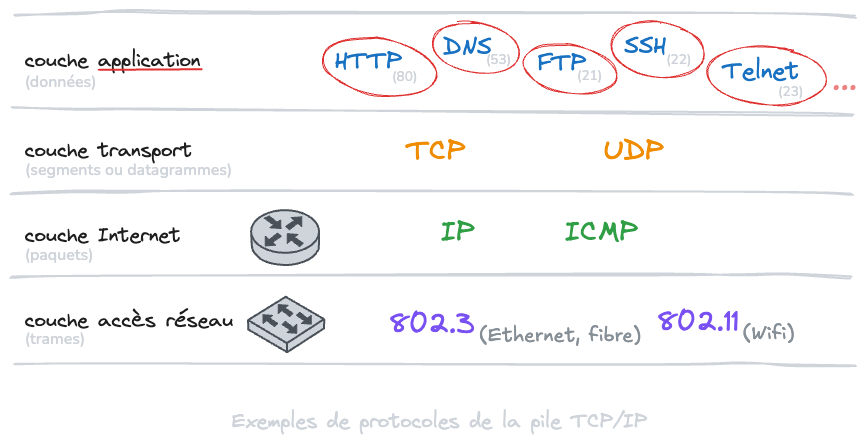 Par exemple le service HTTP, qui permet de transférer des pages Web, opère au niveau de la couche application. Mais pour que les données puissent circuler sur le réseau, elles doivent être gérées par la couche transport, qui attribue un numéro de port à chaque service.