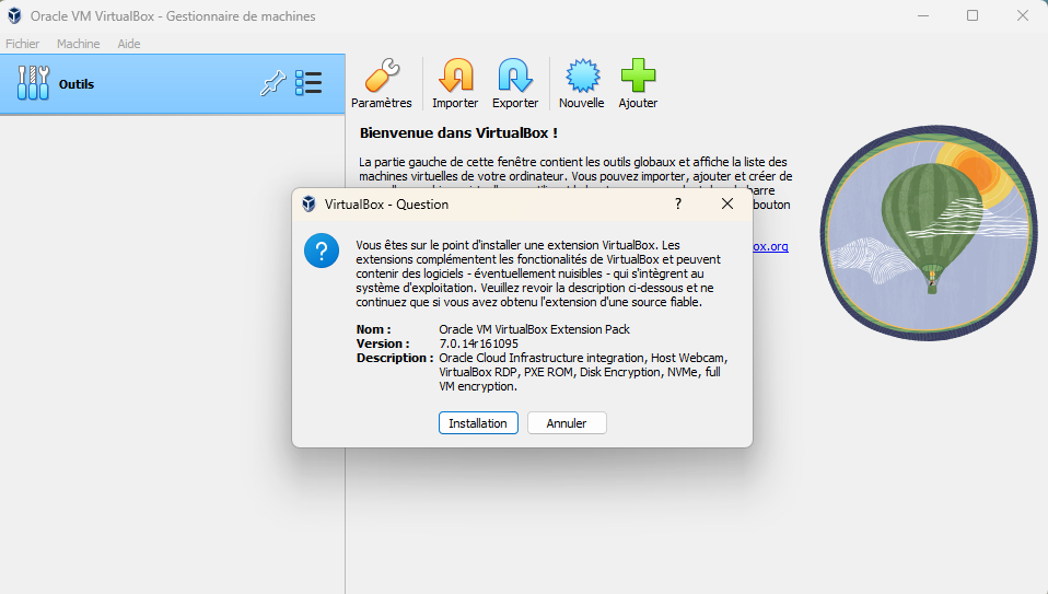 Voici les étapes pour installer le pack d'extensions VirtualBox :
