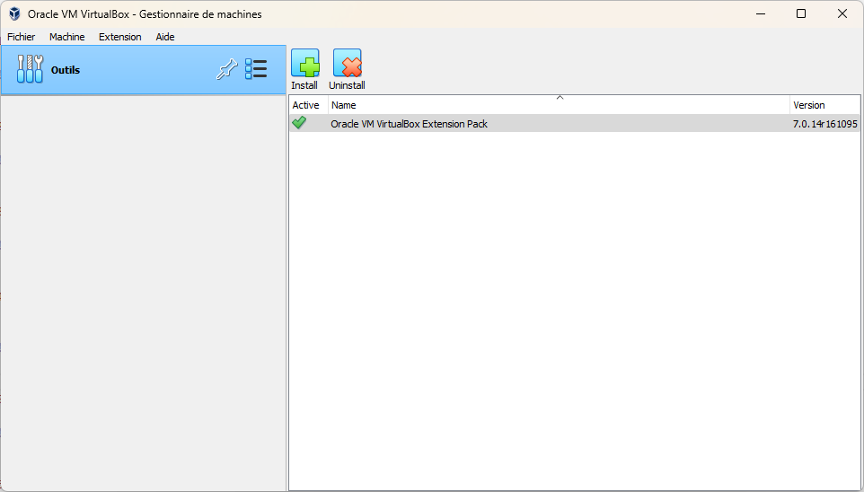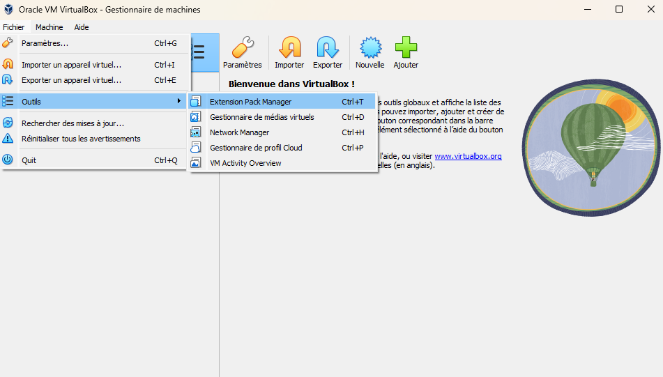- Cliquez, dans le menu, sur Fichier, Outils puis sur Extension Pack Manager, pour vérifier que le pack des extensions de VirtualBox est bien installé.