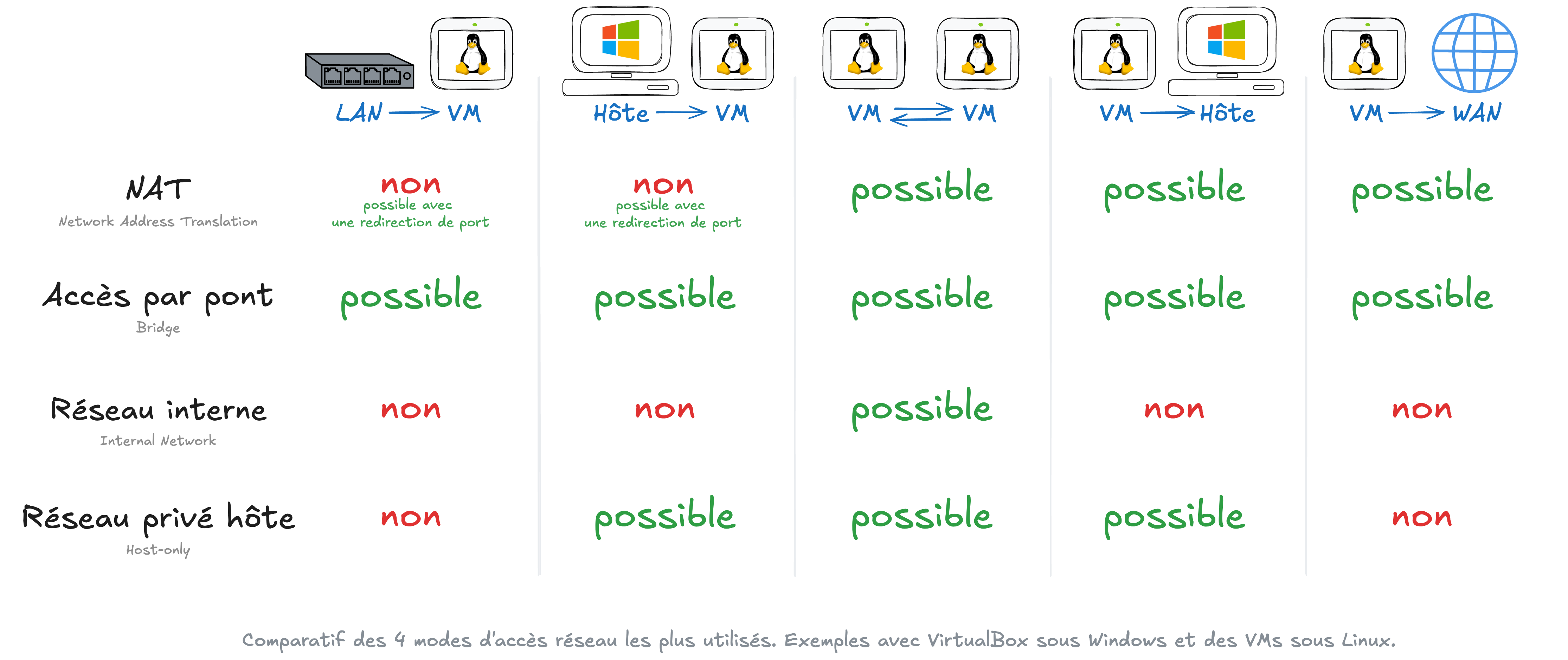 Voici les 7 modes d'accès réseau de VirtualBox (en gras les 4 modes d'accès réseau les plus utilisés) :