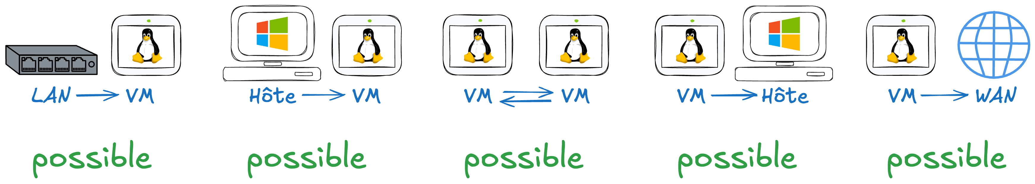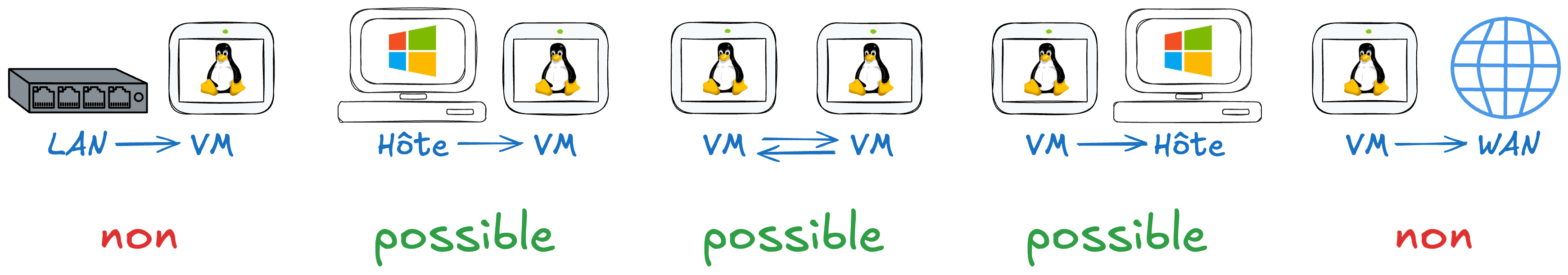- Communication possible entre l'hôte et les VMs
